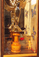 A vintage sewing machine drawer is the box that contains this story, a story many of us share. A "winged victory" statue depicts her feelings. At her feet we see her child, her work, her faith, while her dreams line the walls, under glass. A music box, plays a tune, and mirrors reflect the size of her world. (click on any image to enlarge)